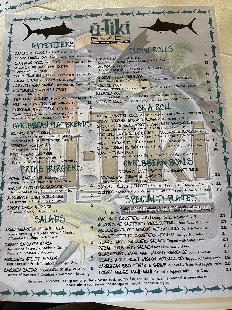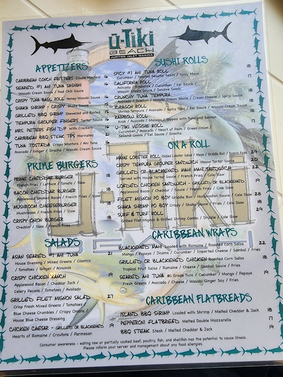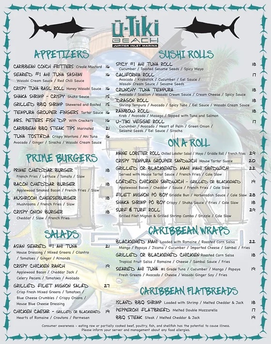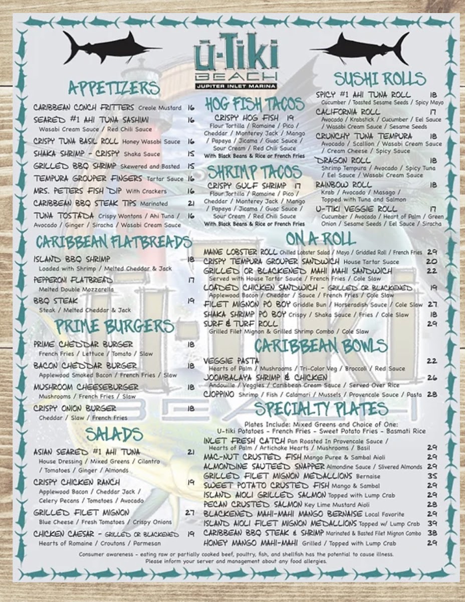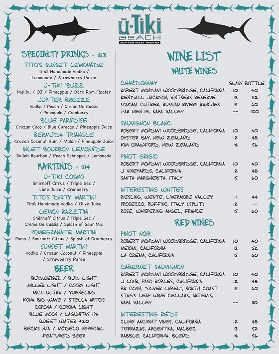 Welcome to the U-Tiki Beach At Jupiter Inlet Marina Menu, where delicious flavors meet a laid-back, coastal vibe. Nestled right by the beautiful Jupiter Inlet, this spot is perfect for enjoying great food with an even better view. Whether you're in the mood for a fresh seafood dish, a juicy burger, or something light and refreshing, you'll find it here. The menu offers a variety of options, from classic comfort food to unique, locally inspired dishes. Everything is crafted with care to ensure you enjoy the freshest ingredients while soaking up the beautiful Florida sunshine. Whether you're dropping by for a quick bite or a leisurely meal with friends, U-Tiki Beach delivers a memorable dining experience with every visit.
