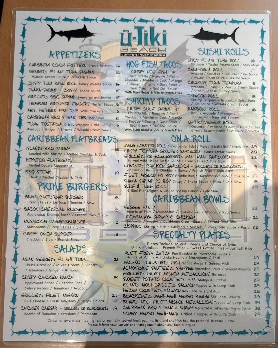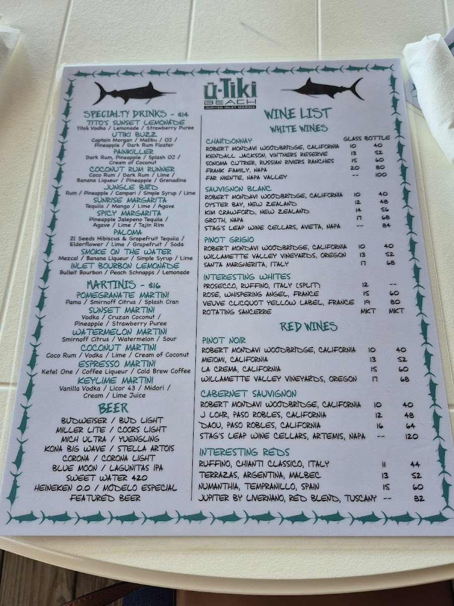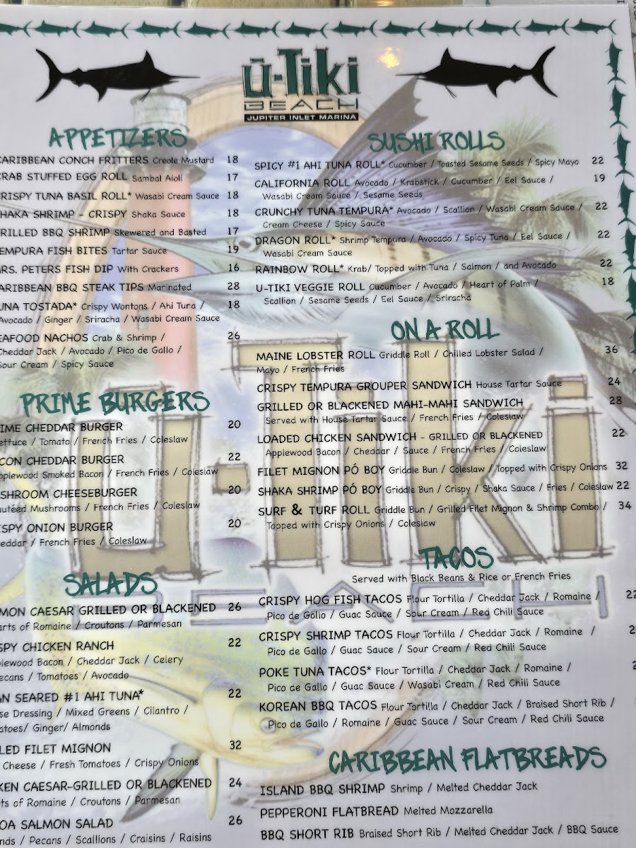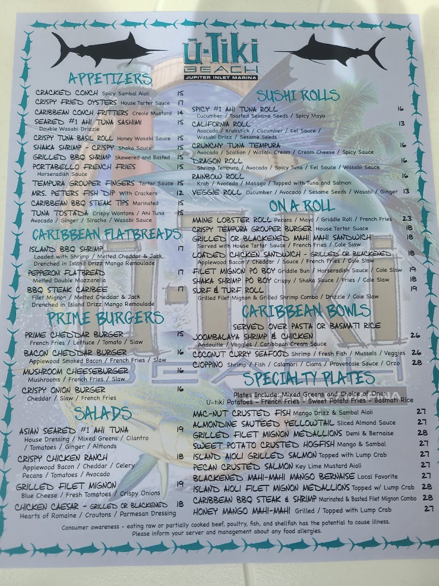 Welcome to the U-Tiki Beach At Jupiter Inlet Marina Menu, where delicious flavors meet a laid-back, coastal vibe. Nestled right by the beautiful Jupiter Inlet, this spot is perfect for enjoying great food with an even better view. Whether you're in the mood for a fresh seafood dish, a juicy burger, or something light and refreshing, you'll find it here. The menu offers a variety of options, from classic comfort food to unique, locally inspired dishes. Everything is crafted with care to ensure you enjoy the freshest ingredients while soaking up the beautiful Florida sunshine. Whether you're dropping by for a quick bite or a leisurely meal with friends, U-Tiki Beach delivers a memorable dining experience with every visit.